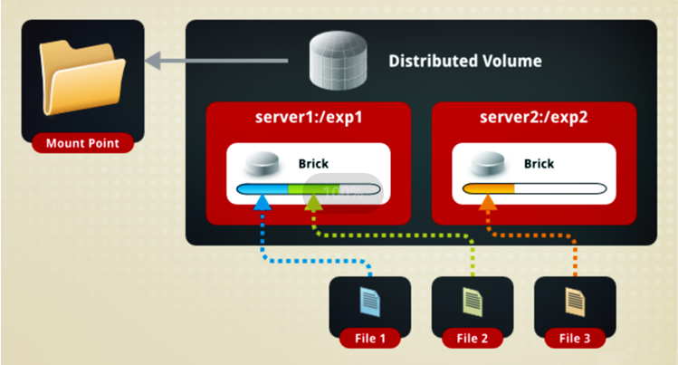 文件通过 HASH 算法分布到所有 Brick Server 上,这种卷是 GlusterFS 的默认卷;以文件为单位根据 HASH 算法散列到不同的 Brick,其实只是扩大了磁盘空间,如果有一块磁盘损坏,数据也将丢失,属于文件级的 RAID0, 不具有容错能力。