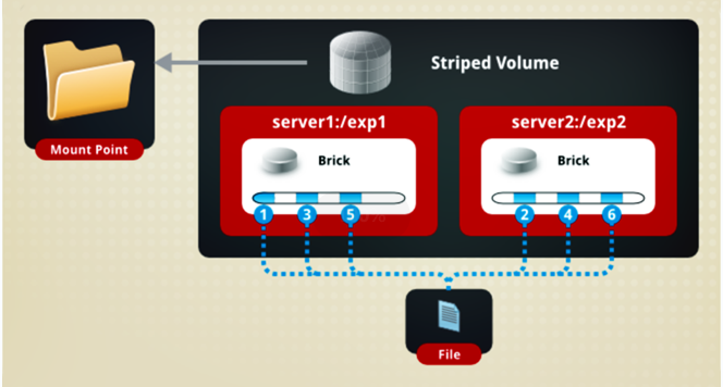 类似 RAID0,文件被分成数据块并以轮询的方式分布到多个 Brick Server 上,文件存储以数据块为单位,支持大文件存储, 文件越大,读取效率越高,但是不具备冗余性。