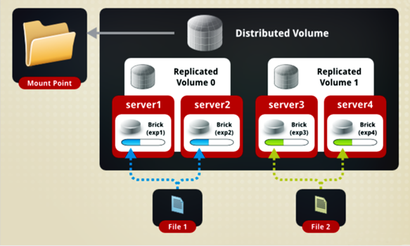 File1 和 File2 通过分布式卷的功能分别定位到 Server1 和 Server2。在存放 File1 时,File1 根据复制卷的特性,将存在两个相同的副本,分别是 Server1 中的exp1 目录和 Server2 中的 exp2 目录。在存放 File2 时,File2 根据复制卷的特性,也将存在两个相同的副本,分别是 Server3 中的 exp3 目录和 Server4 中的 exp4 目录。