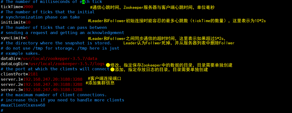 dataLogDir=/usr/local/zookeeper-3.5.7/logs ●添加,指定存放日志的目录,目录需要单独创建