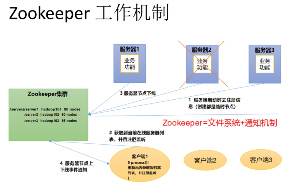 (2)ZooKeeper可以实现实时监控节点状态变化。可将节点信息写入ZooKeeper上的一个ZNode。监听这个ZNode可获取它的实时状态变化。