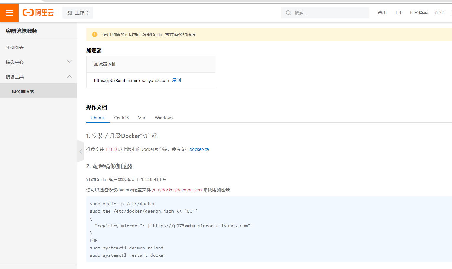 浏览器访问 https://cr.console.aliyun.com/cn-hangzhou/instances/mirrors