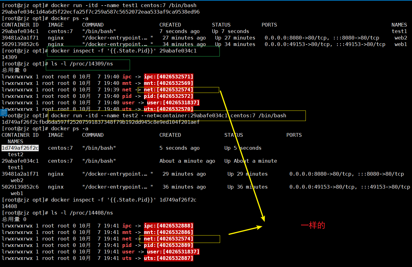 docker run -itd --name test2 --net==container:da5f9d6e9fec centos:7 bash
