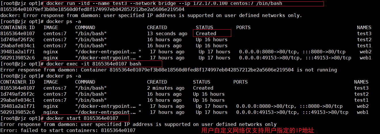 docker run -itd --name test3 --network bridge --ip 172.17.0.100 centos:7 /bin/bash