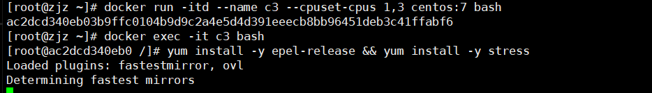 docker run -itd --name c3 --cpuset-cpus 1,3 centos:7 bash