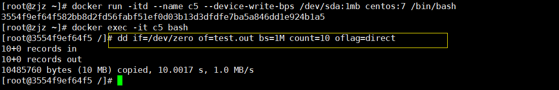 docker run -itd --name c5 --device-write-bps /dev/sda:1mb centos:7 /bin/bash