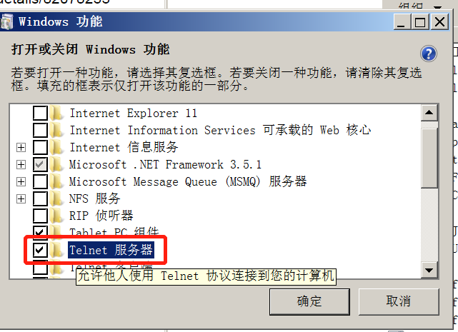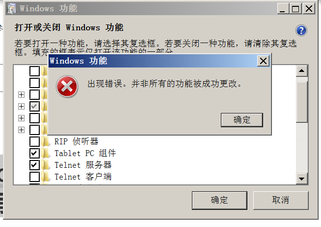 win7在打开或关闭window功能中,安装telnet时,“出现错误,并非所有的功能被成功更改”。