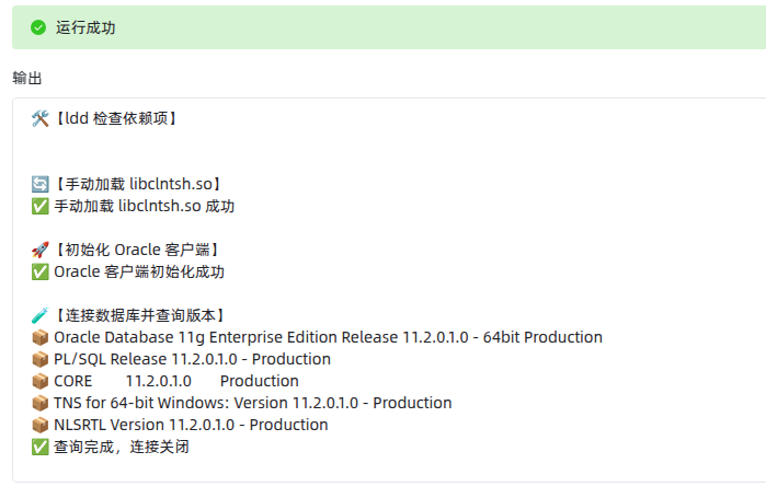 import os import sys import traceback import oracledb import ctypes def connect_oracle(): result = "🔍【Web UI Oracle 连接调试】\n\n" client_path = "/opt/instantclient_11_2" try: # 1️⃣ Python 基本信息 result += f"🟢 Python 版本: {sys.version}\n" result += f"🟢 Python 解释器路径: {sys.executable}\n" # 2️⃣ 检查 Oracle Instant Client result += f"\n📂【检查 Oracle Client 目录】\n" if os.path.exists(client_path): result += f"✅ Oracle Instant Client 存在: {client_path}\n" else: raise Exception(f"❌ Oracle Instant Client 未找到: {client_path}") # 3️⃣ 检查 LD_LIBRARY_PATH,若不含 client_path,则重启进程 ld_library_path = os.environ.get("LD_LIBRARY_PATH", "") if client_path not in ld_library_path: result += f"⚠️ 当前进程 LD_LIBRARY_PATH 不包含 {client_path},将重新设置并重启...\n" os.environ["LD_LIBRARY_PATH"] = client_path result += f"🔁 正在重启 Python 进程...\n\n" os.execv(sys.executable, [sys.executable] + sys.argv) result += f"✅ `LD_LIBRARY_PATH` 已设置: {os.environ['LD_LIBRARY_PATH']}\n" # 4️⃣ 检查 libclntsh.so libclntsh_path = os.path.join(client_path, "libclntsh.so") result += f"\n📂【检查 Oracle 共享库】\n" if os.path.exists(libclntsh_path): result += f"✅ 共享库 `libclntsh.so` 存在: {libclntsh_path}\n" result += f"📏 大小: {os.path.getsize(libclntsh_path)} 字节\n" else: raise Exception(f"❌ 未找到 libclntsh.so: {libclntsh_path}") # 5️⃣ ldd 依赖检查 result += f"\n🛠️【ldd 检查依赖项】\n" ldd_output = os.popen(f"ldd {libclntsh_path}").read() result += ldd_output + "\n" if "not found" in ldd_output or "No such file" in ldd_output: raise Exception("❌ ldd 显示依赖缺失,请检查") # 6️⃣ 手动加载 result += "\n🔄【手动加载 libclntsh.so】\n" ctypes.CDLL(libclntsh_path) result += "✅ 手动加载 libclntsh.so 成功\n" # 7️⃣ 初始化 Oracle 客户端 result += "\n🚀【初始化 Oracle 客户端】\n" oracledb.init_oracle_client(lib_dir=client_path) result += "✅ Oracle 客户端初始化成功\n" # 8️⃣ Oracle 数据库连接与查询 result += "\n🧪【连接数据库并查询版本】\n" # 请替换为你的实际账号信息 username = "system" password = "orcl" dsn = "(DESCRIPTION=(ADDRESS=(PROTOCOL=TCP)(HOST=10.19.136.161)(PORT=1521))(CONNECT_DATA=(SERVICE_NAME=orcl.localdomain)))" try: conn = oracledb.connect(user=username, password=password, dsn=dsn) cursor = conn.cursor() cursor.execute("SELECT * FROM v$version") rows = cursor.fetchall() for row in rows: result += f"📦 {row[0]}\n" cursor.close() conn.close() result += "✅ 查询完成,连接关闭\n" except Exception as qe: result += f"❌ 查询失败: {qe}\n" except Exception as e: result += f"\n❌ 发生错误: {str(e)}\n" result += f"📜 详细错误信息:\n{traceback.format_exc()}\n" return result