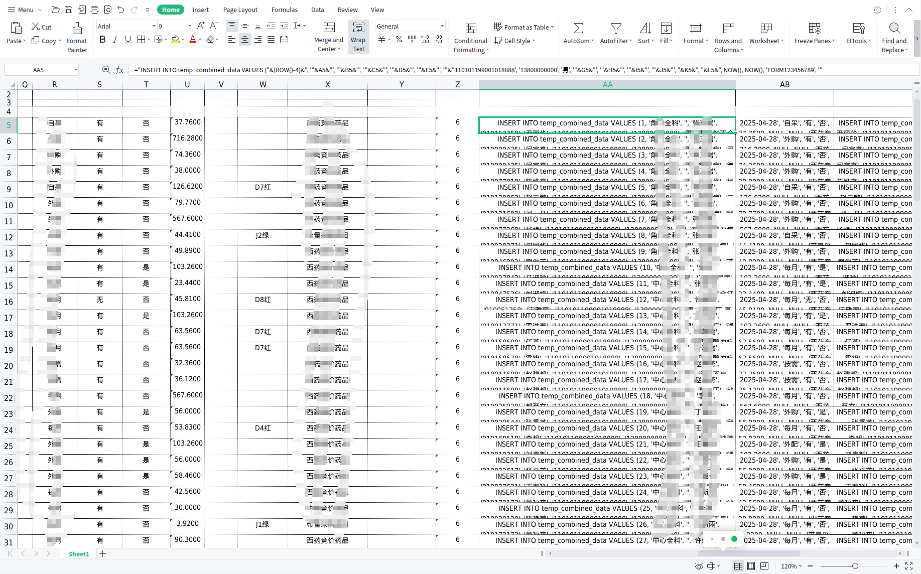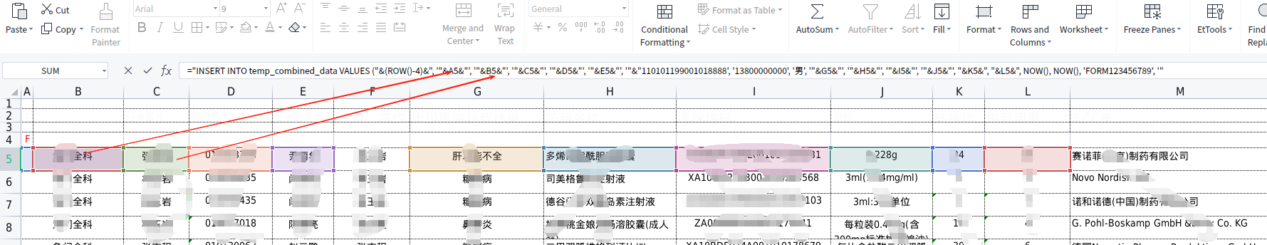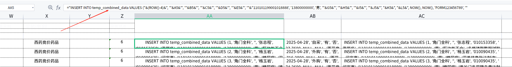 ="INSERT INTO temp_combined_data VALUES (" & (ROW()-4) & ", '" &