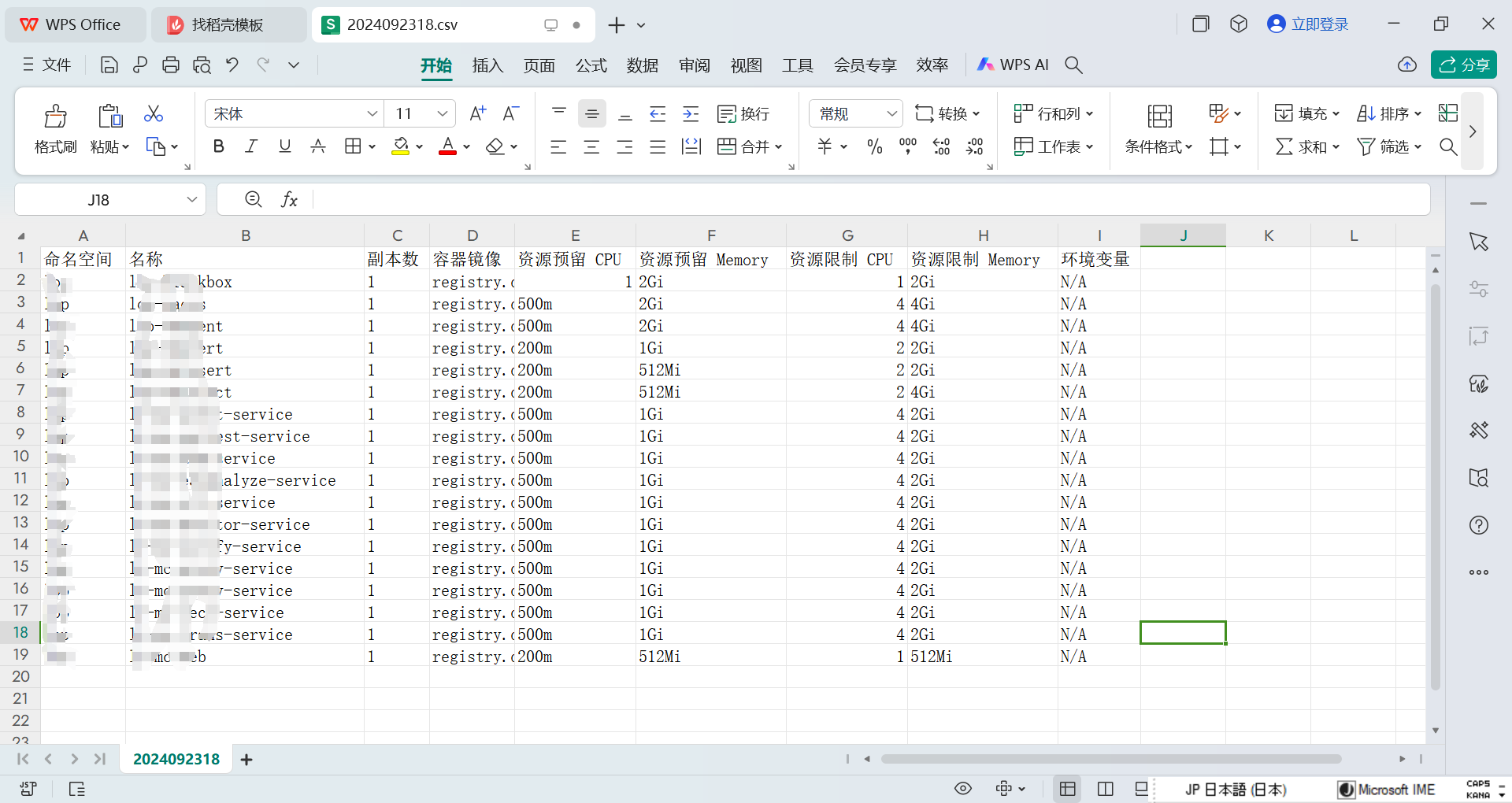 f.write("命名空间,名称,副本数,容器镜像,资源预留 CPU,资源预留 Memory,资源限制 CPU,资源限制 Memory,环境变量\n")