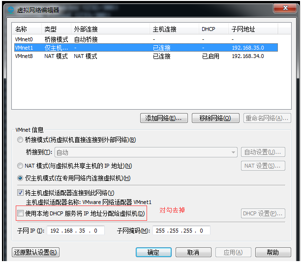 在新开一台机器开始安装系统,将网卡模式设置为仅主机模式,将VMnet1对勾去掉,保证与服务端的网卡在一个网卡上: