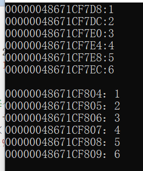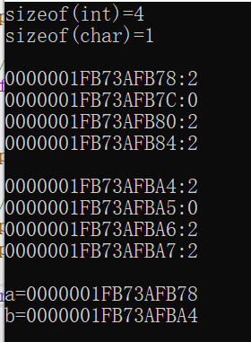 #include<stdio.h> #define N 4 int main() { int a[N] = { 2,0,2,2 }; char b[N] = { '2','0','2','2' }; int i; printf("sizeof(int)=%d\n", sizeof(int)); printf("sizeof(char)=%d\n", sizeof(char)); printf("\n"); //输出数组a中每个元素的地址、值 for (i = 0; i < N; ++i) printf("%p:%d\n", &a[i], a[i]); printf("\n"); //输出数组b中每个元素的地址,值 for (i = 0; i < N; ++i) printf("%p:%c\n", &b[i], b[i]); printf("\n"); //输出数组名a和b对应的值 printf("a=%p\n", a); printf("b=%p\n", b); return 0; }