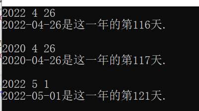 #define _CRT_SECURE_NO_WARNINGS #include<stdio.h> int days_of_year(int year, int month, int day);//函数声明 int main() { int year, month, day; int days; while (scanf("%d%d%d", &year, &month, &day) != 0)//按下Ctrl+D终止 { days = days_of_year(year, month, day);//函数调用 printf("%4d-%02d-%02d是这一年的第%d天.\n\n", year, month, day, days); } } int days_of_year(int year, int month, int day) { int i, sum = 0; int a[13] = { 0,31,28,31,30,31,30,31,31,30,31,30,31 }; for (i = 1; i < month; ++i) sum = sum + a[i]; sum += day; if (year % 4 == 0 && year % 100 != 0 || year % 400 == 0) return ++sum; else return sum; }