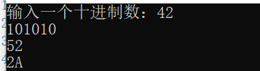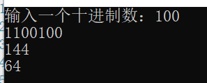 #define _CRT_SECURE_NO_WARNINGS #include<stdio.h> void dec2n(int x, int n); int main() { int x; printf("输入一个十进制数:"); scanf("%d", &x); dec2n(x, 2); dec2n(x, 8); dec2n(x, 16); return 0; } void dec2n(int x, int n) { int s[1000] = { 0 }; int i, j,sum; for (i = 0; x != 0; i++) { sum = x % n; x = x / n; s[i] = sum; } for (j = i - 1; j >= 0; j--) { if (s[j] >= 10) printf("%c", s[j] + 55); else printf("%d", s[j]); } printf("\n"); }