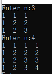 #define _CRT_SECURE_NO_WARNINGS #include <stdio.h> #define N 100 void fun(int x[N][N], int n); void output(int x[N][N], int n); int main() { int x[N][N], n; while (printf("Enter n:"), scanf("%d", &n) != 0) { fun(x, n); output(x, n); } return 0; } void fun(int x[N][N], int n) { for (int i = 0; i < n; ++i) { for (int j = 0; j < n; ++j) { if (i - j >= 0) x[i][j] = j + 1; else x[i][j] = x[i][j - 1]; } } } void output(int x[N][N], int n) { for (int i = 0; i < n; ++i) { for (int j = 0; j < n; ++j) { printf("%d ", x[i][j]); } printf("\n"); } }