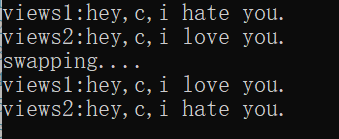 #define _CRT_SECURE_NO_WARNINGS #include<stdio.h> #define N 80 int main() { char views1[N] = "hey,c,i hate you."; char views2[N] = "hey,c,i love you."; printf("views1:%s\n", views1); printf("views2:%s\n", views2); char t[N]; int i; for (i = 0; i < N; ++i) { t[i] = views1[i]; views1[i] = views2[i]; views2[i] = t[i]; } printf("swapping....\n"); printf("views1:%s\n", views1); printf("views2:%s\n", views2); return 0; }