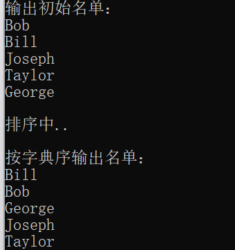 #define _CRT_SECURE_NO_WARNINGS #include<stdio.h> #include<string.h> #define N 5 #define M 20 void bubble_sort(char str[][M], int n); int main() { char name[][M] = { "Bob","Bill","Joseph","Taylor","George" }; int i; printf("输出初始名单:\n"); for (i = 0; i < N; i++) printf("%s\n", name[i]); printf("\n排序中..\n"); bubble_sort(name, N); printf("\n按字典序输出名单:\n"); for (i = 0; i < N; i++) printf("%s\n", name[i]); return 0; } void bubble_sort(char str[][M], int n) { int i, j, k; char t[M]; for (i = 0; i < N - 1; i++) { for (j = 0; j < N - 1 - i; j++) { k = strcmp(str[j], str[j + 1]); if (k > 0) { strcpy(t, str[j]); strcpy(str[j], str[j + 1]); strcpy(str[j + 1], t); } } } }