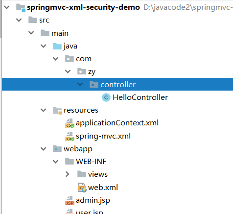 新建好项目之后在webapp下添加了两个jsp文件,adminPage.jsp和index.jsp。其中adminPage.jsp只有那些拥有ROLE_ADMIN,ROLE_USER其中一种权限的用户才能访问,而index.jsp只允许那些拥有ROLE_USER权限的用户才能访问。