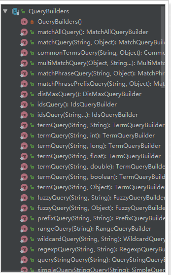 QueryBuilders提供了大量的静态方法,用于生成各种不同类型的查询对象,例如:词条、模糊、通配符等QueryBuilder对象。