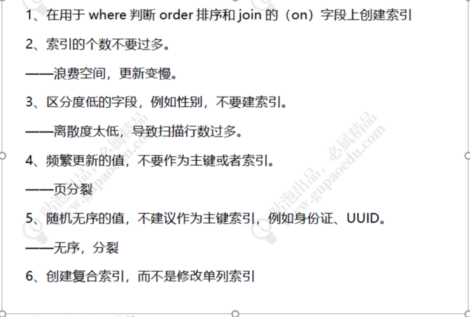 - 存储引擎的选择,常规的innodb,查询多的myisam,临时数据多的memory,表结构的构建,字段的类型选择,比如性别用tinyint,varchar代替char,不要使用外键,触发器,视图等,不要使用数据库存图片。