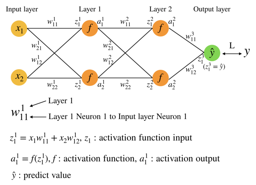- \(w_{ij}^{l}\) 表示 第\(l\)层中的第\(j\)个神经元与前一层第\(i\)个神经元之间的连接权重
