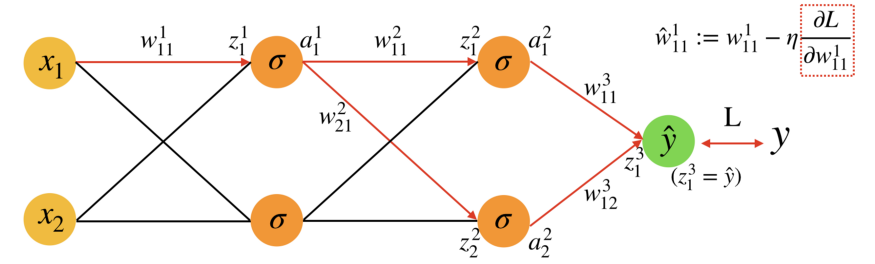我们以求解第1层第一个神经元的权重\(w_{11}^{1}\)为例子,红色箭头表示其会通过那些路径影响倒loss,反过来,loss也是通过原路径去影响到这个权重