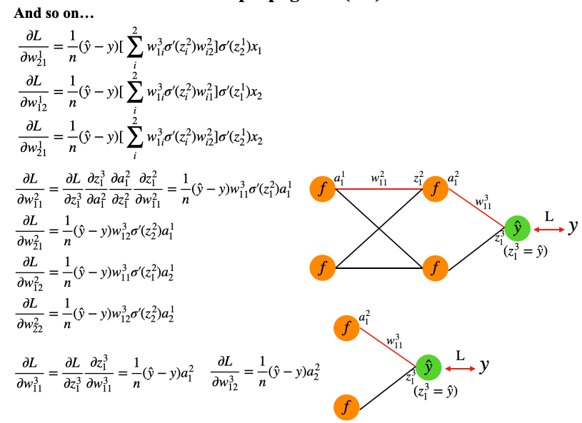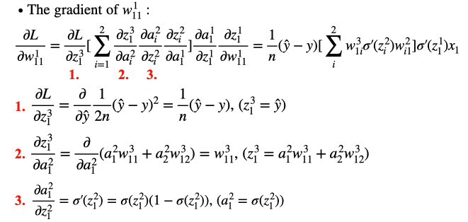 注意此处输出层并未被激活,所以我们忽略loss对输出的求导,否则loss还需要对\(\sigma(z)\) 求一次导