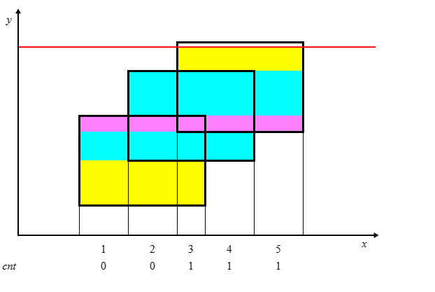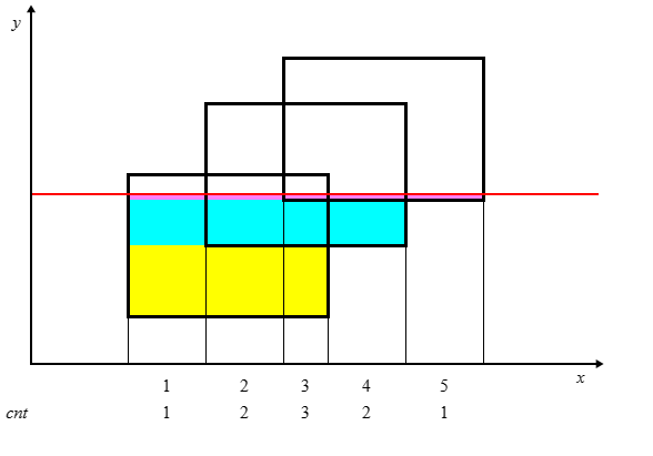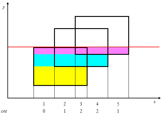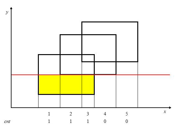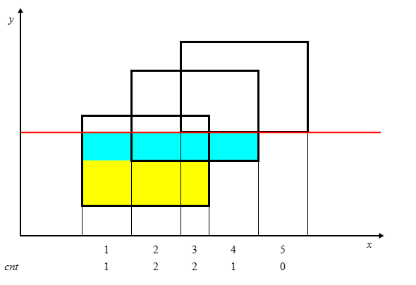 给每一个矩形的上下边进行标记,下面的边标记为 1,上面的边标记为 -1。每遇到一个水平边时,让这条边(在横轴投影区间)的权值加上这条边的标记。