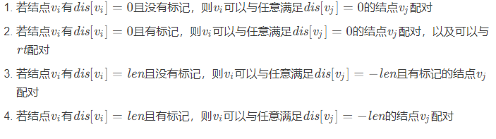 这个题还是蛮有意思的。设阴的边权为-1,阳的为1,那么满足阴阳平衡的即为路径和为0的。这个就可以判断整条路是否符合要求。现在考虑这个休息站,记每个点到根的距离为dis[i],加入从这个点到根的路径上有另一个节点满足dis[j]=dis[i],就给i这一节点打上标记,分为以下4种情况: