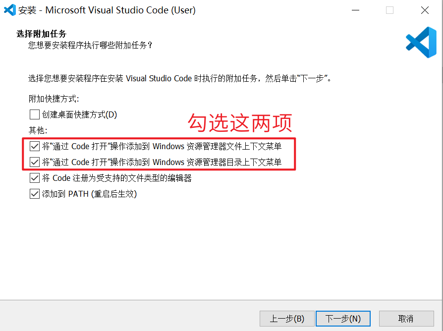 VScode建议直接使用我们资料包或者下载最新版的重新安装一次,以确保版本是最新的或者和教程的一样。VScode的安装过程有一步骤是需要注意的(其他软件按照默认的选项安装即可),详细请看安装视频或者下图所示: