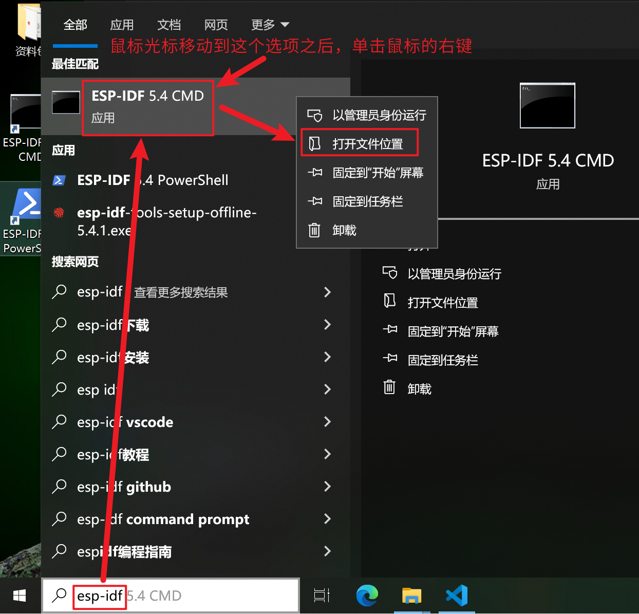 ESP-IDF,然后鼠标先移动到得出的选项的上面,然后单机鼠标的右键,在弹出的菜单栏中选择打开文件位置选项,操作过程如下图所示: