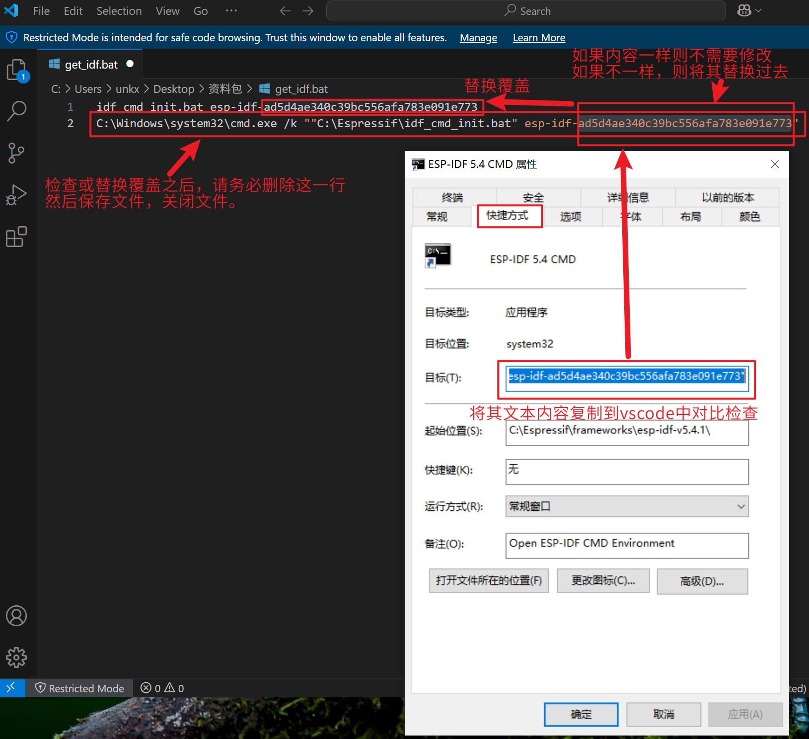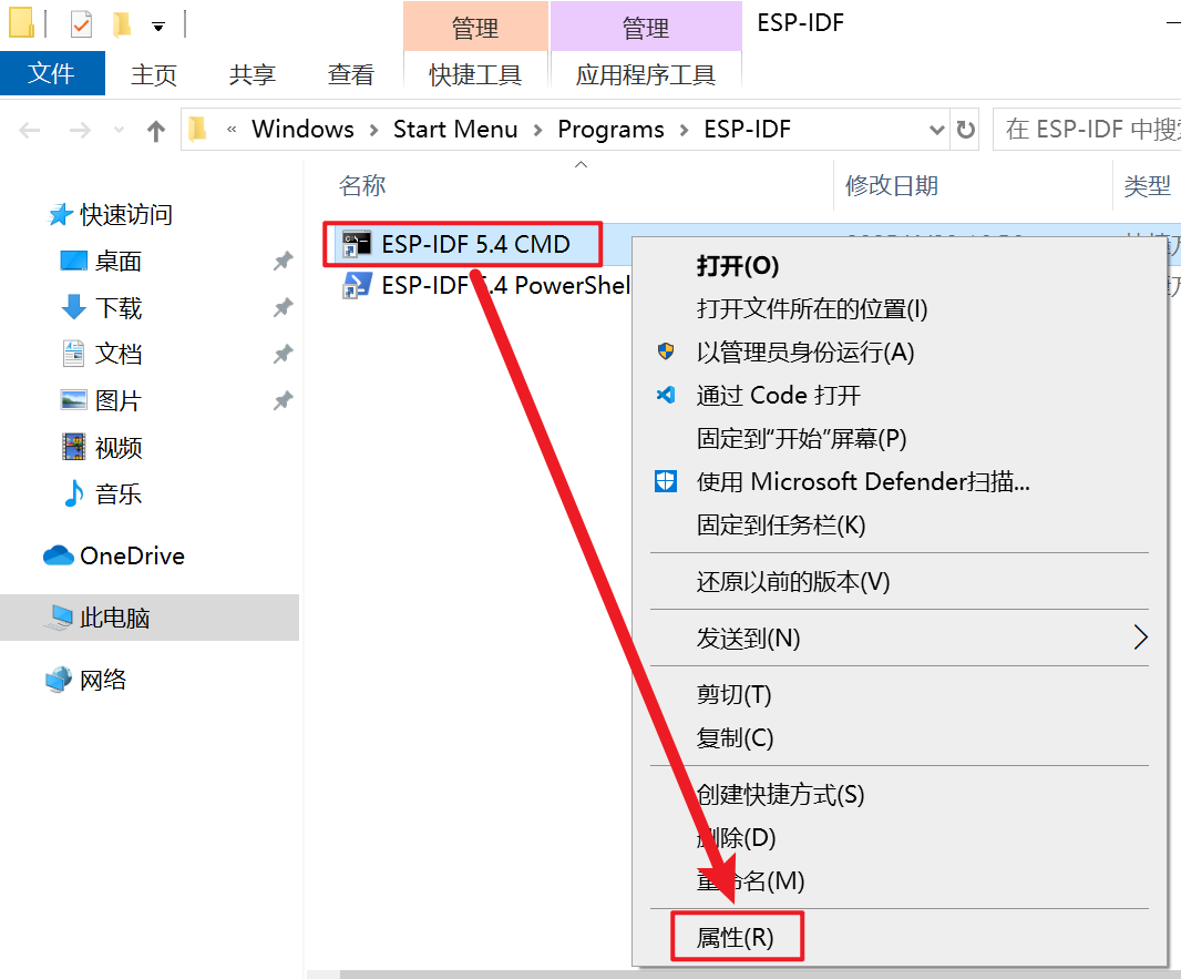ESP-IDF 5.4 CMD的快捷方式。鼠标单击选中该快捷方式,在弹出的菜单中选择属性选项,然后在弹出的窗口中选择快捷方式一栏查看目标里面的文本内容,将其文本内容复制vscode编译器中对比,如果esp-idf-xxxxx部分不一样则修改get_idf.bat的内容保持一直,如下图所示: