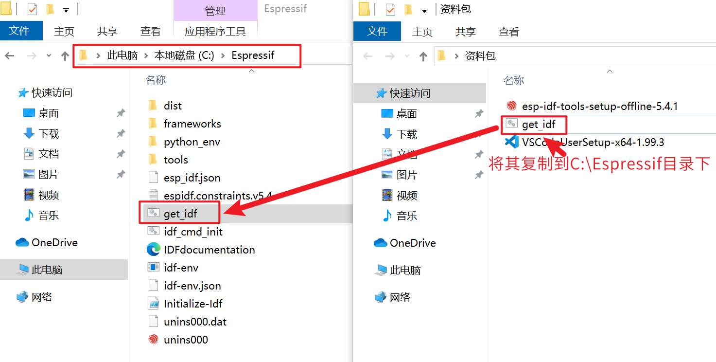 4.重要,打开esp-idf的安装目录,默认是:C:\Espressif,然后将资料包中get_idf.bat(确保该文件已按照上面的操作检查或修改过了)复制到esp-idf的安装目录,如下图所示: