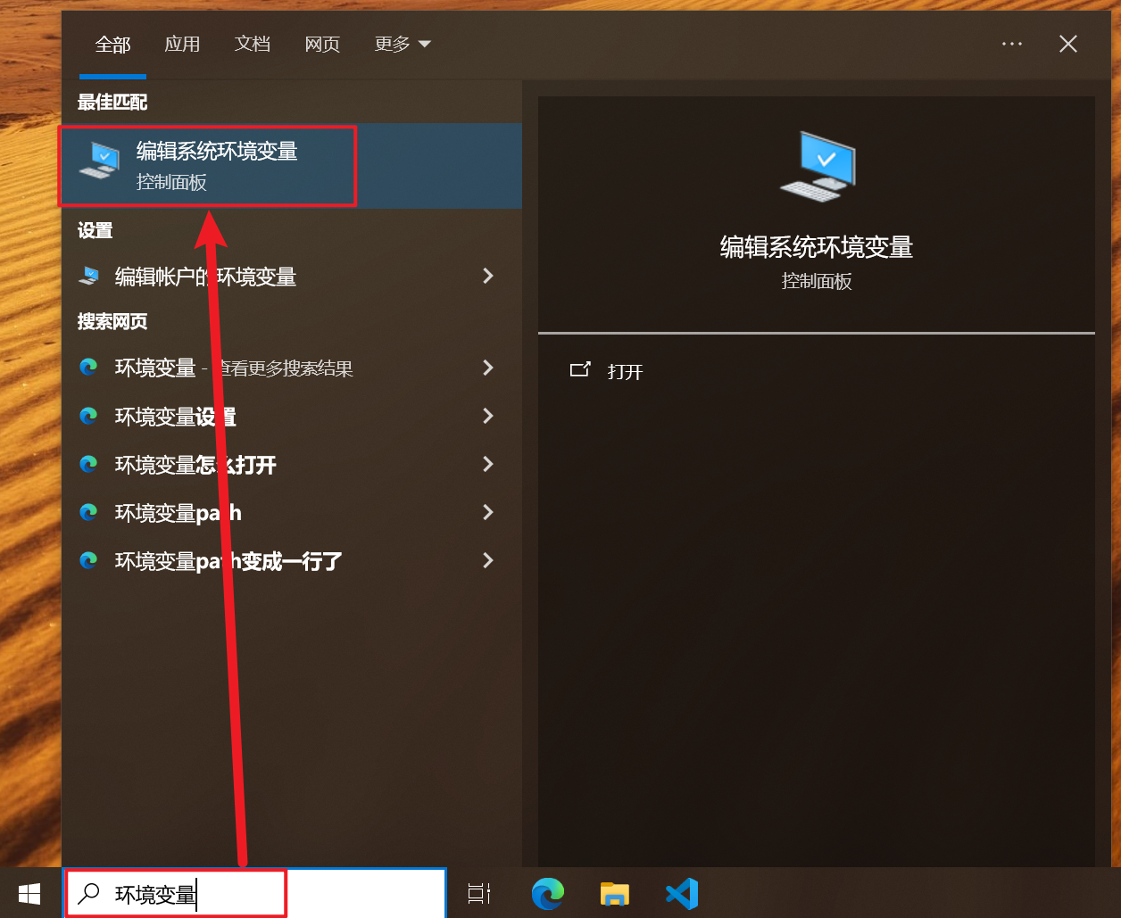 按下键盘上的win按键,然后在弹出的搜索栏中输入环境变量,进入系统的环境变量设置,如下图所示:
