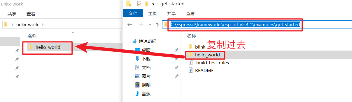在esp-idf的安装目录中有很多官方内置的示例,我们是可以直接复制出来使用的(不能直接在里面打开编译报错,要复制到其他地方使用),示例目录的路径是:C:\Espressif\frameworks\esp-idf-v5.4.1\examples。这里我们用一个入门示例进行测试,示例的路径是:C:\Espressif\frameworks\esp-idf-v5.4.1\examples\get-started。打开之后会复制hello_world目录到D:\unkx-work目录下(如果没有D:\unkx-work目录请自行新建)。操作过程如下图所示: