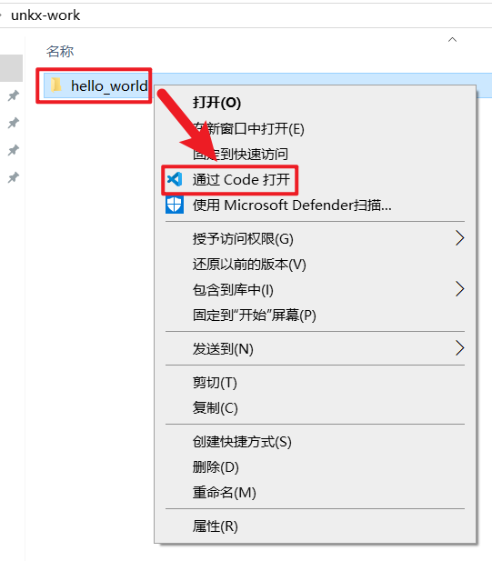 在D:\unkx-work目录中通过单击鼠标左键选中刚刚复制过来的hello_world目录;然后再按下鼠标右键,在弹出的菜单栏中选择通过VScode打开,操作过程如下图所示: