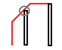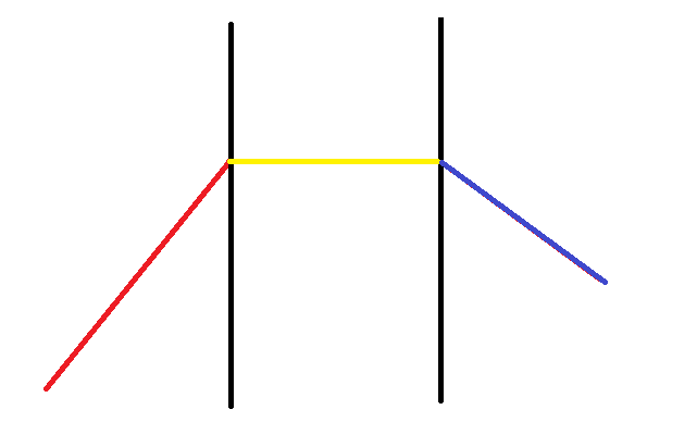 贪心地选择,必然在红色和蓝色段尽量多的选择 右下 和 右上,因为这可以减少总的移动次数。怎样尽量多的选择?以红色段为例,我们考虑在最开始的时候抬升到一个位置,使得其可以持续向右上走直到达到黄色段的高度。如图: