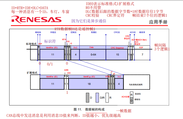 在 CAN 协议中,所有的消息都以固定的格式发送。总线空闲时,所有与总线相连的单元都可以