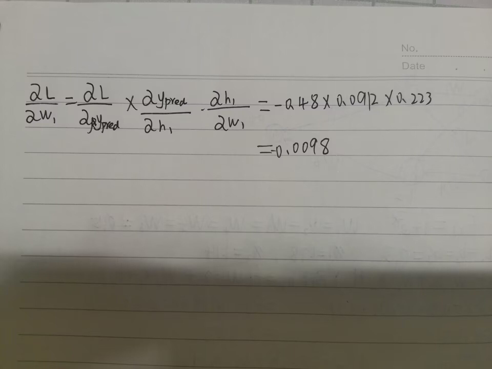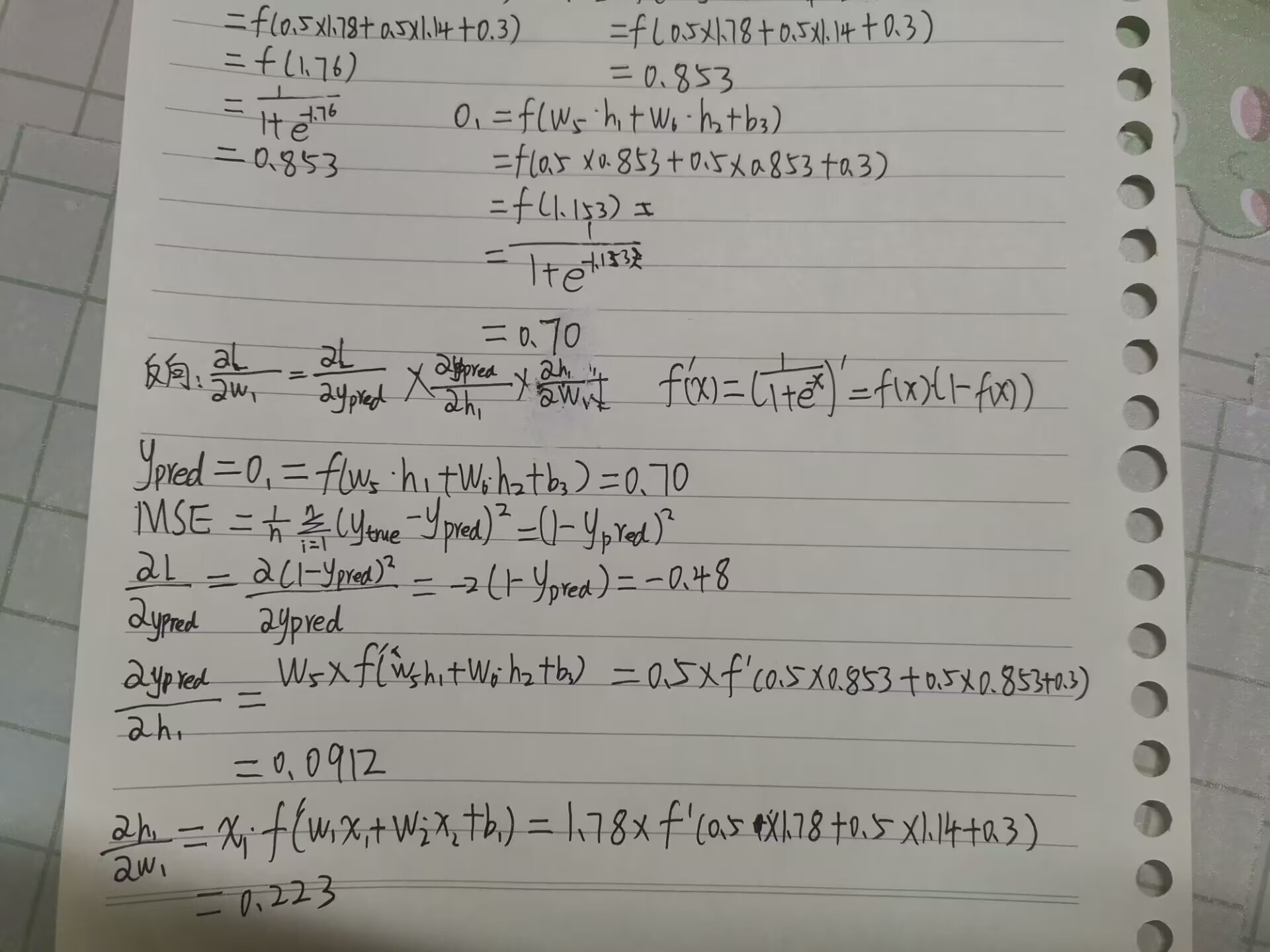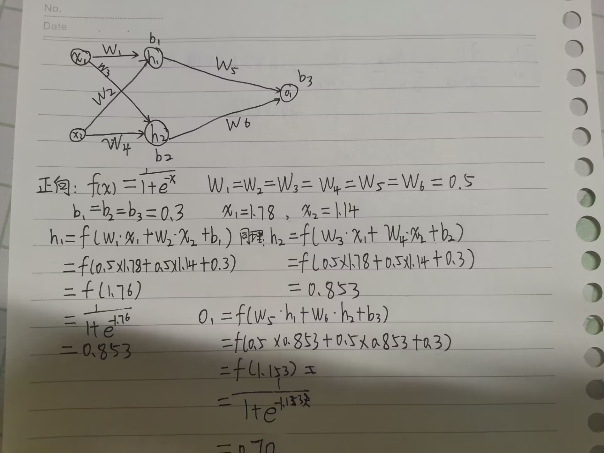 2.初始化所有权重值w为0.5,所有偏置项b值为0.3,以第一条数据为例,写出完整的神经网络正向推理和反向传播计算过程;