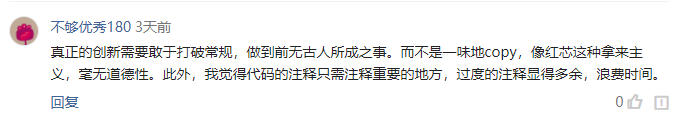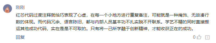 红芯代码过度注释就恰巧表现了心虚,在每一个小地方进行重复备注,可能就是一种掩饰、无故凑行数的体现。而代码冗余、语言陈旧,都与内部人员基本功不扎实脱不开联系。学艺不精的同时直接搬运其他成功代码,实在是是不可取的。只有将一己所学融于创新精神,才能收获正在的成功。