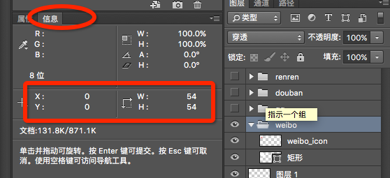 选中图层, Ctrl+T (mac: Commond + T), 在信息面板查看图层信息;