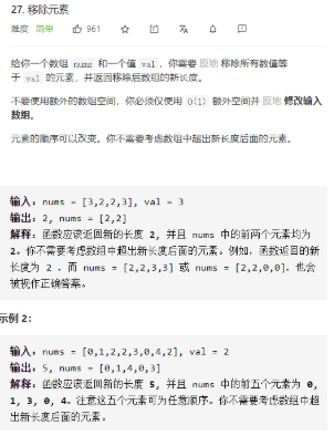 class Solution { public: int removeElement(vector<int>& nums, int val) { int ans=0,left=-1,right=0; while(right<nums.size()){ if(nums[right]==val)right++; else { left++; ans++; nums[left]=nums[right]; right++; } } return ans; } };