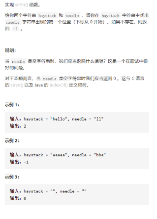 class Solution { public: int strStr(string haystack, string needle) { if(needle.size()==0)return 0; if(haystack.size()==0)return -1; for(int i=0;i<haystack.size();i++){ int cur1=i,cur2=0; while(1){ if(haystack[cur1]!=needle[cur2])break; cur1++,cur2++; if(cur2==needle.size())return i; } } return -1; } };