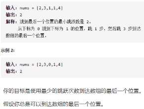 class Solution { public: int jump(vector<int>& nums) { int nowfind = 0, n = nums.size(), lastfind = 0, ans = 0; for (int i = 0; i < n - 1; ++i) { if (nums[i]+i>nowfind)nowfind=nums[i]+i; if(nowfind>=n-1){ ans++; break; } if (i == lastfind) { lastfind = nowfind; ++ans; } } return ans; } };