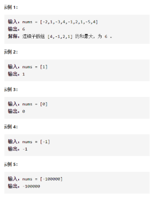 class Solution { public: int maxSubArray(vector<int>& nums) { int n=nums.size(); if(n==1)return nums[0]; int ans=nums[0]; int dpi1=nums[0]; for(int i=1;i<n;i++){ int dpi=max(dpi1+nums[i],nums[i]); ans=max(ans,dpi); dpi1=dpi; } return ans; } };