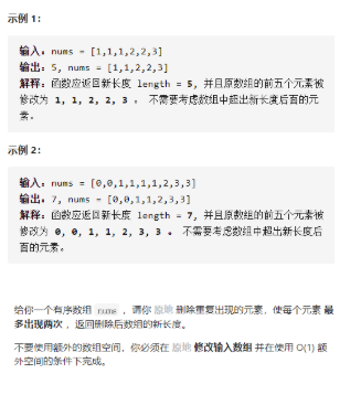 class Solution { public: int removeDuplicates(vector<int>& nums) { int n=nums.size(); if(n<3)return n; int left=1,right=2; while(right<n){ if(nums[right]==nums[left-1]){ right++; continue; } left++; nums[left]=nums[right]; right++; } return left+1; } };