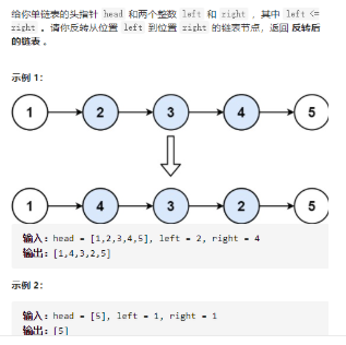 class Solution { public: ListNode* reverseBetween(ListNode* head, int left, int right) { if(left==right)return head; ListNode*dummy=new ListNode(0,head); ListNode*first=dummy,*cur=head->next; for(int i=1;i<=left-1;i++){ first=first->next; cur=cur->next; } ListNode *pre=first->next; for(int i=left+1;i<=right;i++){ ListNode*prepre=first->next,*nex=cur->next; first->next=cur; pre->next=nex; cur->next=prepre; cur=nex; } return dummy->next; } };