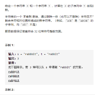 class Solution { public: int numDistinct(string s, string t) { int n=s.size(),m=t.size(); vector<vector<long long>>dp(n+1,vector<long long>(m+1,0)); for(int i=0;i<=n;i++)dp[i][0]=1; for(int i=1;i<=n;i++){ for(int j=1;j<=m;j++){ if(s[i-1]==t[j-1]){ dp[i][j]=dp[i-1][j]+dp[i-1][j-1]; if(dp[i][j]>INT_MAX)dp[i][j]=0; } else if(s[i-1]!=t[j-1])dp[i][j]=dp[i-1][j]; } } return dp[n][m]; } }; 踩过的坑 leetcode上sizeof(long)=sizeof(long long)=8