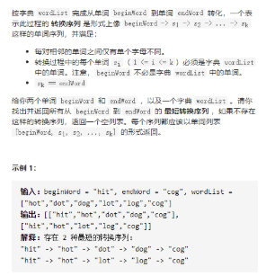 每一层,从curArr最后一个字符串变化一下后(用回溯),如果在dict就curArr并放进容器(用回溯),直到变化后是endWord,遍历层序遍历遍历容器,容器里面是每一层的字符串数组,fori--取出当前层的字符串数组curArr,记录curArr最后一个字符串为tail,如果tail==endWord更新答案,否则,对tail的每个字符,用a到z26个字符代替,如果代替后,dict找到相同的,用哈希集hadTry存储方便后序排除这种情况,放到curArr,curArr放到容器,或者不要tail继续尝试变成其他tail,如果tail当前字符a-z都不行了,tail当前字符回溯回原来并对tail其他字符操作。每次container某一次遍历完如果ans有了立刻结束,否则只能删除掉dict中hadTry过的字符串并进入下一层