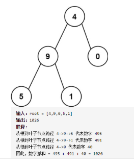 class Solution { public: int sumNumbers(TreeNode* root) { int ans=0,ans1=0; dfs(root,ans,ans1); return ans; } void dfs(TreeNode*root,int &ans,int ans1){ if(!root->left&&!root->right){ ans1=ans1*10+root->val; ans+=ans1; return; } ans1=ans1*10+root->val; if(root->left)dfs(root->left,ans,ans1); if(root->right)dfs(root->right,ans,ans1); } };
